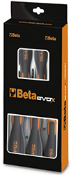 Cacciaviti Beta EVOX: impugnatura ergonomica con foro, calotta sferica con riportata misura e impronta, lame elastiche e durevoli. In scatola serie pz.5: art.1201E 3,5x100 - 5,5x150 - 6,5x150 e art.1202E PH1x4,5x80-PH2x6x100.