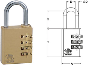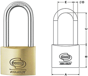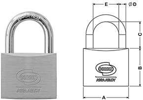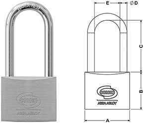 Corpo in ottone. Arco carbonitrurato. 2 chiavi. Doppio scrocco di bloccaggio per misure 40-50-60-70. Chiave grezza ricambio: mm.20/ns.cod.595904, mm.25/ns.cod.595905, mm.30/ns.cod.880060, mm.40/ns.cod.880058, mm.50-60/ns.cod.880050, mm.70/ns.cod.880054.