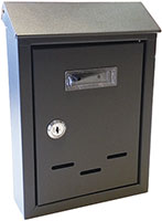 Per esterni. In lamiera verniciata colore ghisa. Serratura a cilindro. 2 chiavi. Sportello frontale per il prelievo. Feritoia imbucalettere anteriore e superiore protetta da tettuccio.