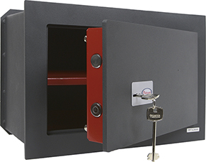 Cassaforte da incasso. Serratura chiave doppia mappa a 2 giri. Frontale in acciaio mm.8 a taglio laser. 2 catenacci. Finitura grigio scura. In dotazione 2 chiavi.