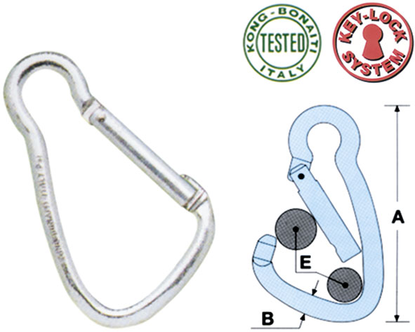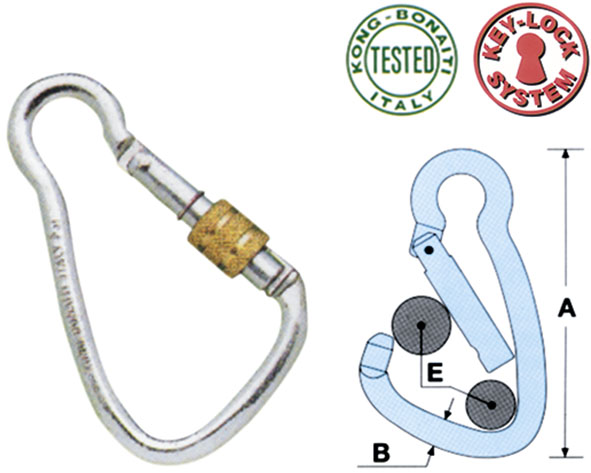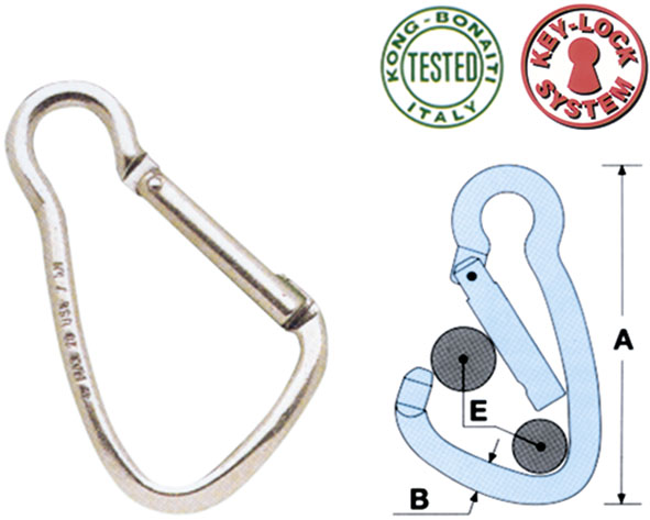 INOX. KEY-LOCK SISTEM l'unica chiusura senza impigli. Questo sistema di chiusura brevettato trae il suo nome dalla forma dell'incastro tra la leva ed il corpo del moschettone. E' stato eliminato qualsiasi dente di tenuta sia sul corpo del moschettone che sulla leva, ora completamente cilindrica. Non esiste pi? alcun punto di possibile impiglio della corda durante l'inserimento e lo sgancio.