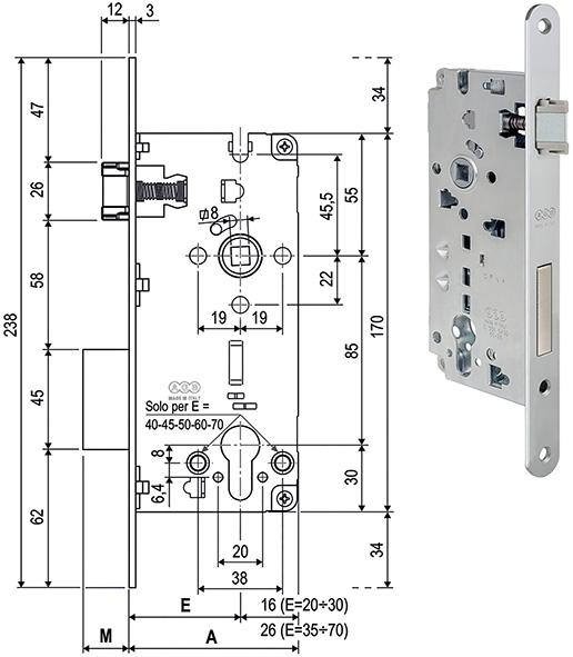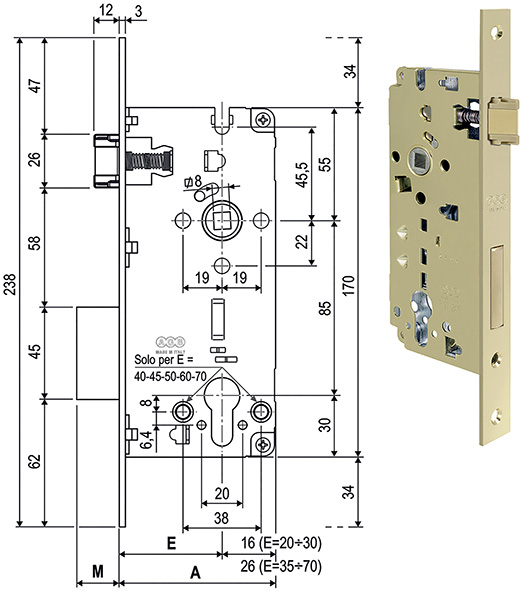 Contropiastra bordo tondo. Spessore mm.2. Dimensioni uguali a quelle del frontale della serratura: larghezza mm.22, lunghezza mm.238. Spigolo smussato nel punto di contatto con lo scrocco per favorire la chiusura ed attutire l'urto del battente. Per aperture sia destre che sinistre.