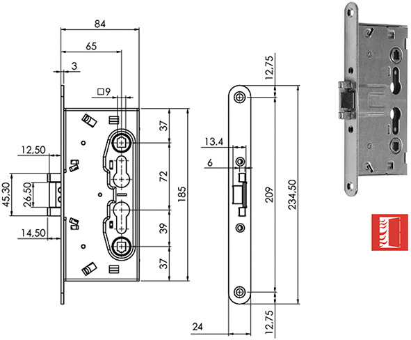 Serrature da infilare reversibili per porte tagliafuoco. Scrocco e catenaccio. Esterno e interno: la chiave richiama sia lo scrocco che il catenaccio, la maniglia richiama solo lo scrocco. Quadro maniglia mm.9.