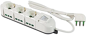 3 prese bipasso + schuko 2P+T 16A. + 6 prese bipasso laterali 2P+T 16A. Spina a squadra 2P+T 16A. Cavo mt.1,5 sezione 3x1. Con interruttore luminoso. Portata max 3500 W.