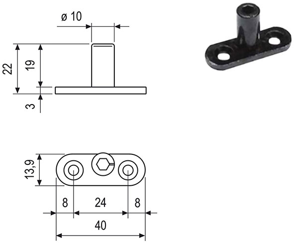 Perno di chiusura diritto registrabile in acciaio, per fissaggio su legno, alluminio o PVC. Registrabile con chiave a brugola da mm.5.