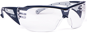 Design sportivo, per visi di forma sottile. Lente trasparente AF antiappannante, in policarbonato, trattamento antigraffio e antistatico. Protezione UV 100%. Campo visivo illimitato. Montatura colore BLU/GRIGIO. Profilo in gomma supplementare. Morbido appoggio sul naso. Stanghette confortevoli. Peso ridotto. CE certificati DPI EN166-EN170.
