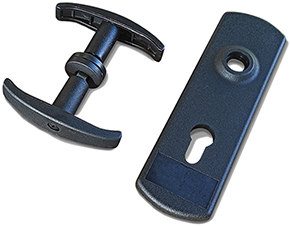 Kit maniglie per basculanti con placca. Foro cilindro sagomato. Foro maniglia d.mm.18. Interasse mm.70. In plastica nera.