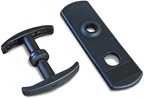 Kit maniglie per basculanti con placca. Foro cilindro tondo d.mm.26. Foro maniglia d.mm.18. Interasse mm.67. In plastica nera.