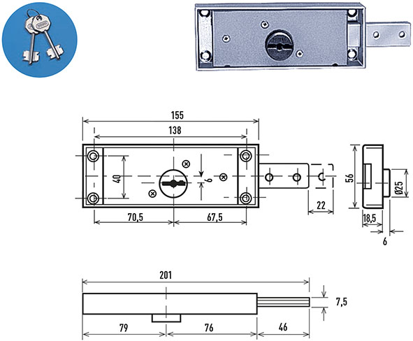 Serrature doppia mappa 6 gorges a 2 mandate. Versione con 1 catenaccio DESTRO. Boccola guida chiave esterna integrata. Movimentazione con chiave sia dall'esteno che dall'interno. In dotazione 2 chiavi (ricambio ns.cod.596636).