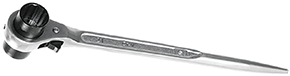 Chiave per ponteggi reversibile a cricchetto. Corpo in acciaio cromo vanadio. Bussola mm.21-22. Rapida inversione del senso di serraggio.