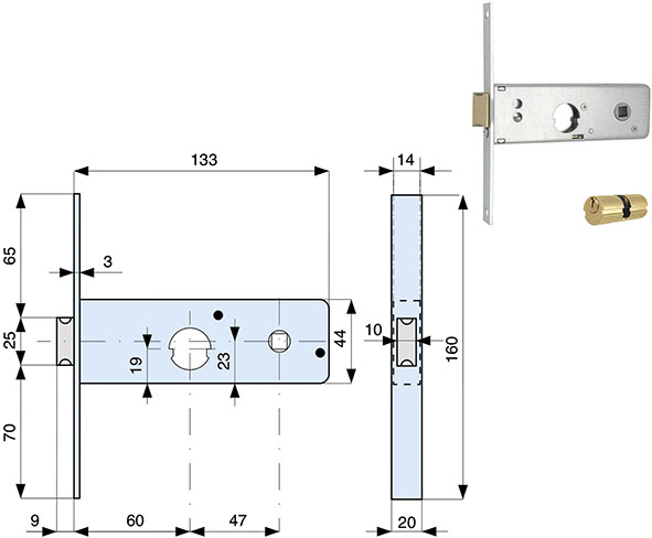 Serrature da infilare a cilindro per fasce. 2 mandate e scrocco. Catenaccio in ottone. Frontale in acciaio zincato mm.20. Quadro maniglia mm.8. In dotazione cilindro ribaltabile doppio tondo MG 020520 ns.cod.839245.