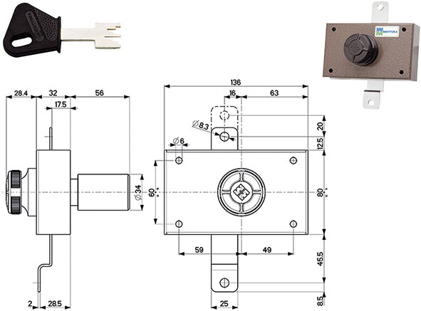 Blocca aste da applicare, alto sopra la serratura, verniciato. Per serrature con corsa aste compresa tra mm.17 e 20. Entrata 63. Apertura interna con pomolo. Esterno cilindro a pompa L mm.50 con 3 chiavi (92105). Senza asta di collegamento (93317) da ordinare a parte se necessaria.